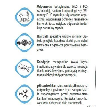Composition : farine de volaille (29%), maïs, blé, graisse de volaille, farine de poisson, germe de blé, graines de tournesol, foies de volaille hydrolysés, graines de lin, substances supplémentaires, chlorure de choline, taurine, MOS (mannanoligosaccharides), FOS (fructooligosaccharides), bêta-glucanes, lysine, méthionine, Yucca, L-carnitine, myrtille, culture probiotique.