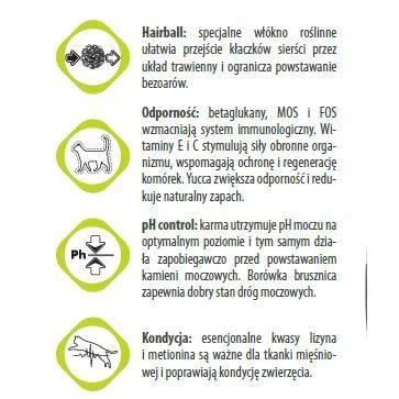 Composition : Farine de volaille (28%), maïs, riz, farine de poisson, germe de blé, blé, graisse de volaille, graines de tournesol, foies de volaille hydrolysés, fibres végétales, graines de lin, taurine, substances supplémentaires, MOS (mannanooligosaccharides), FOS (fructooligosaccharides), bêta-glucanes, lysine, méthionine, chlorure de choline, Yucca, myrtille, culture probiotique.