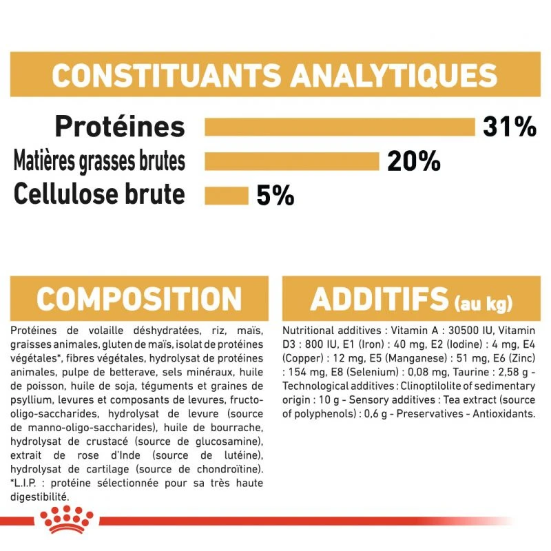ROYAL CANIN Maine Coon Adulte est enrichi en taurine et en acides gras EPA et DHA (acides gras oméga 3) pour favoriser la fonction cardiaque. Les chats Maine coon ont une grande mâchoire, ce qui affecte la façon dont ils prennent et mâchent la nourriture. La forme unique de la croquette, adaptée à la taille des mâchoires du chat, encourage une mastication plus longue, ce qui favorise l’hygiène buccale.