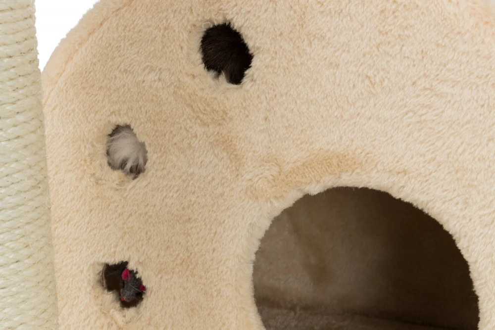 grattoir multifonctionnel dédié aux chats de toutes races et de toutes tailles. Il est fabriqué à partir de matériaux de haute qualité. Le premier niveau se compose de nombreuses surfaces à gratter et d’un fauteuil en peluche muni d’une corde sur laquelle le chat peut grimper ou qu’il peut gratter en la lançant vers le haut – le chat saura quoi faire avec un morceau de corde. Sur l’étagère du milieu se trouve un lit pour chat – une cachette – et une étagère avec un trou par lequel le chat peut regarder ce qui se passe au fond du griffoir. Tout en haut, il y a un centre de commandement pour les chats – un siège très confortable, une chaise longue pour les chats, petits et grands. Il a été rembourré avec de la peluche supplémentaire pour un confort maximal.