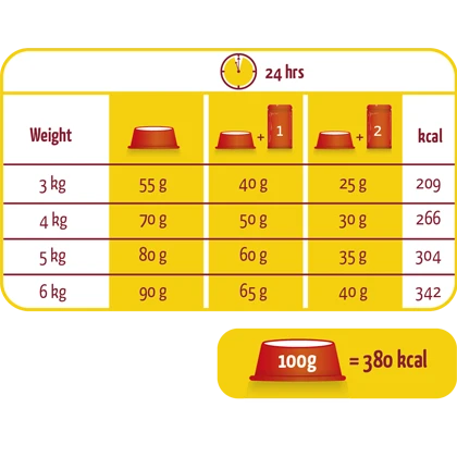 protéine 32,0%, teneur en matiÚres grasses 10,0%, cellulose brute 2,0%, cendres brutes 7,5%, calcium 1,1%, phosphore 1,0%, taurine 0,2%